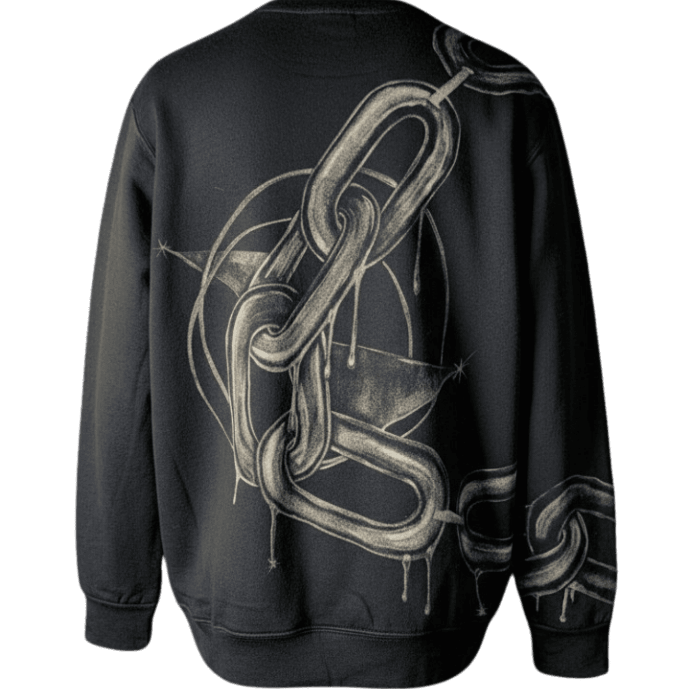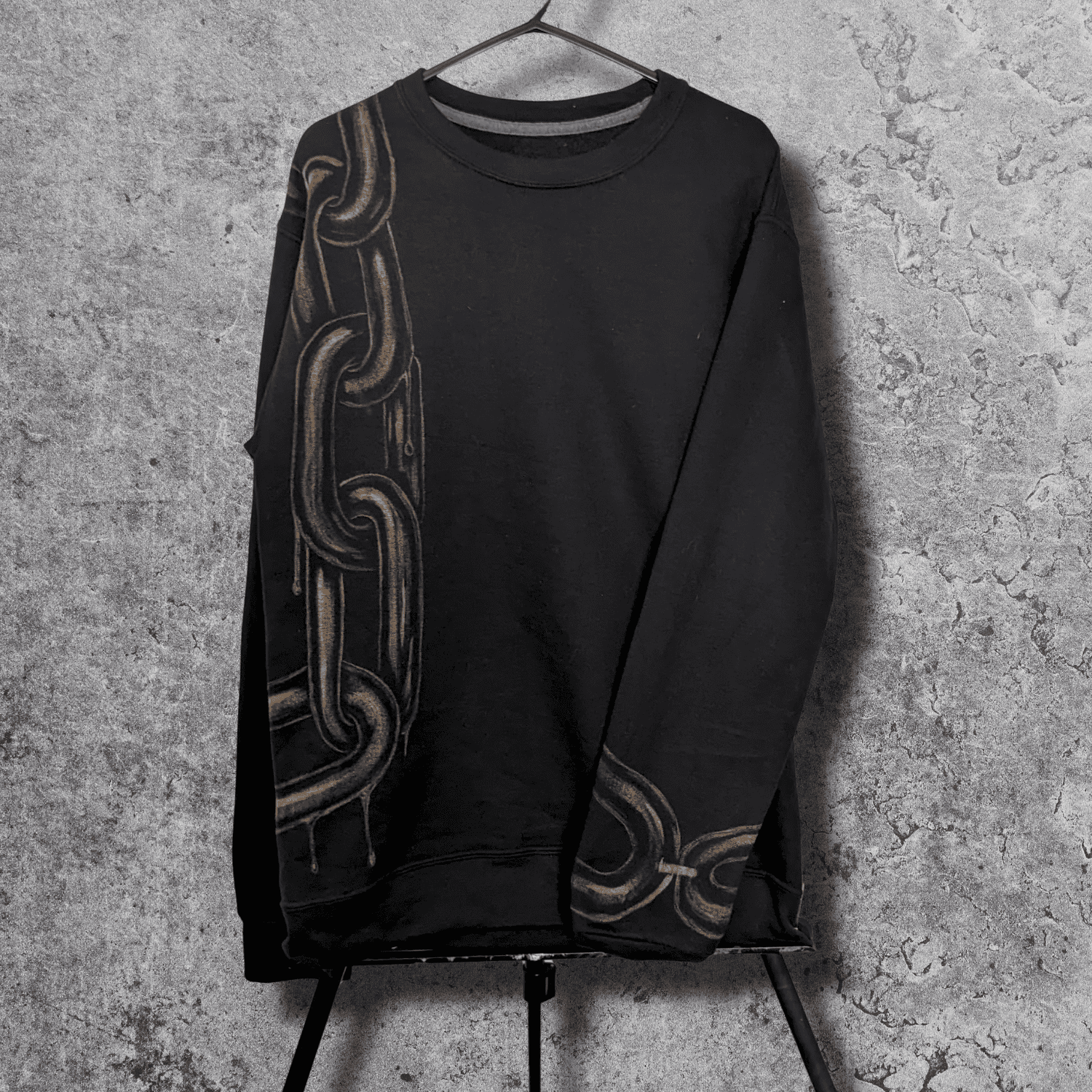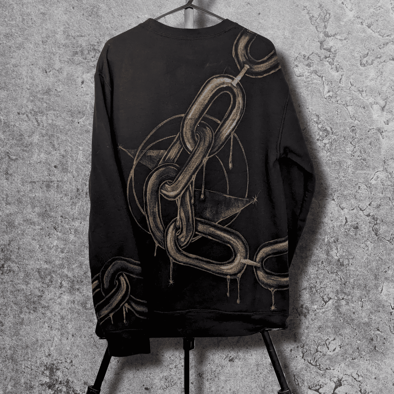 A chain drapes the shoulder, runs down the front, and loops across the back — heavy links wrapping the body as if the wearer is part of the mechanism. The paint drips like molten metal, giving weight and motion to what should be fixed and cold.