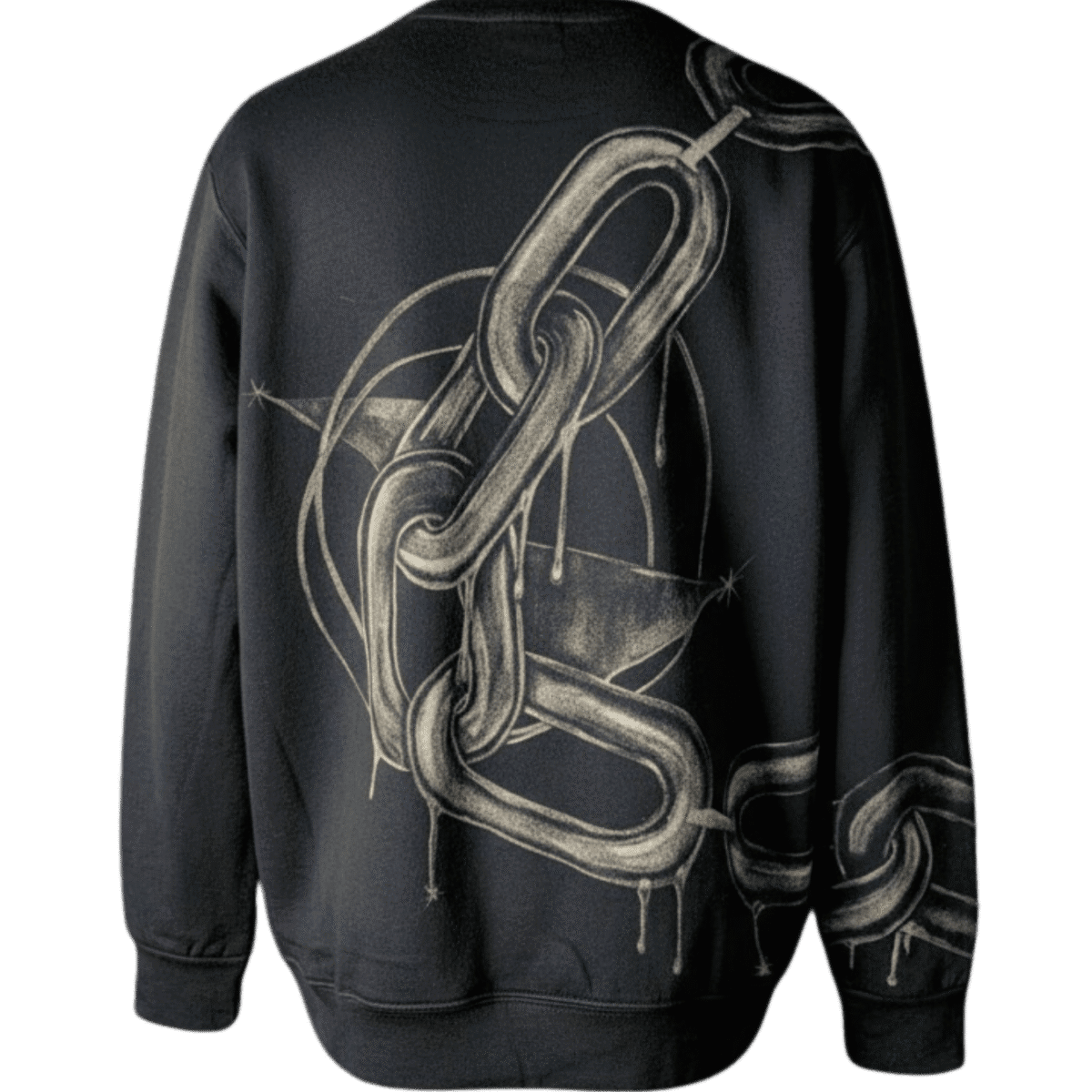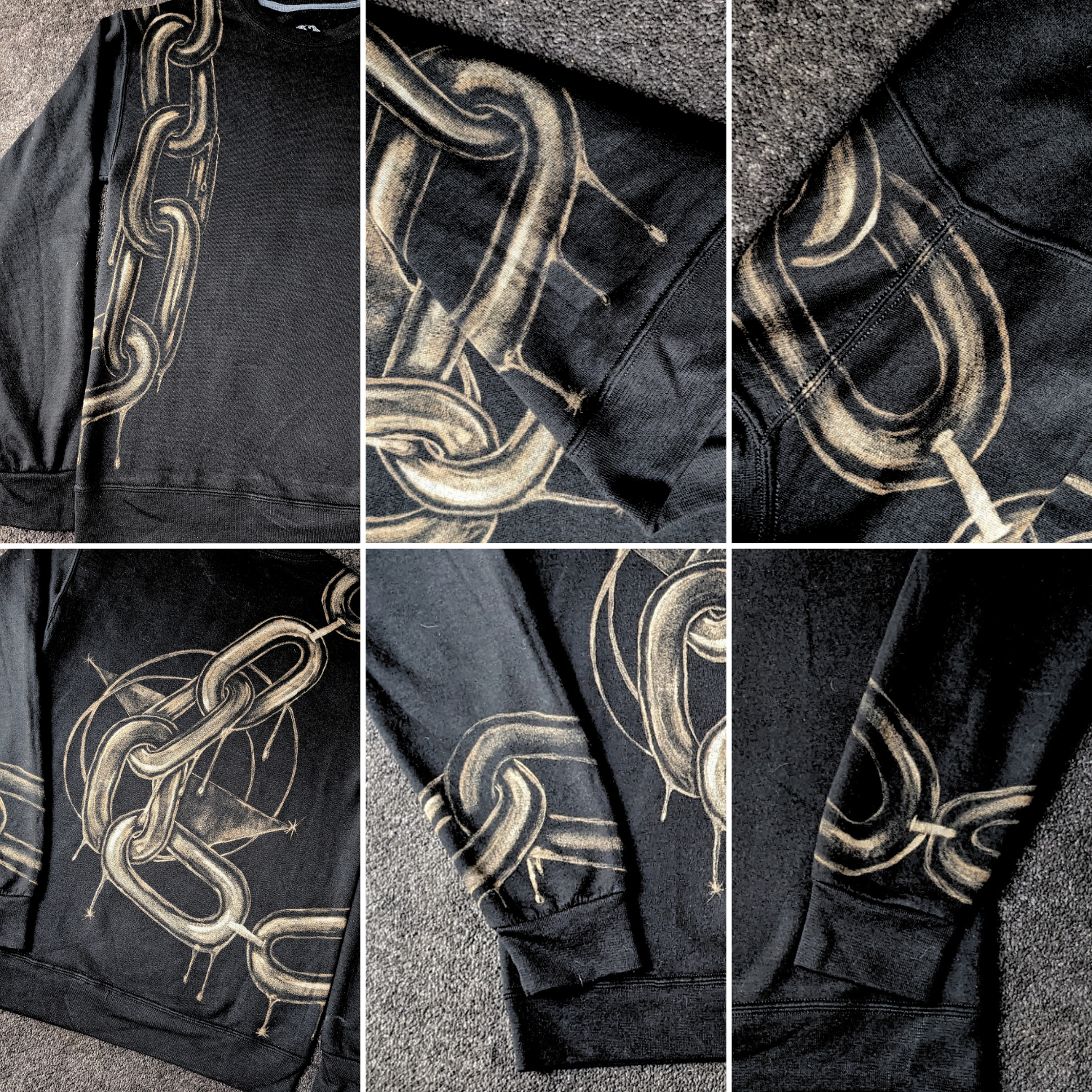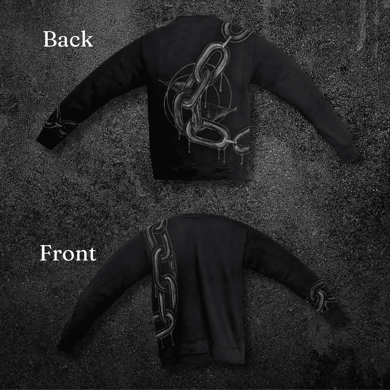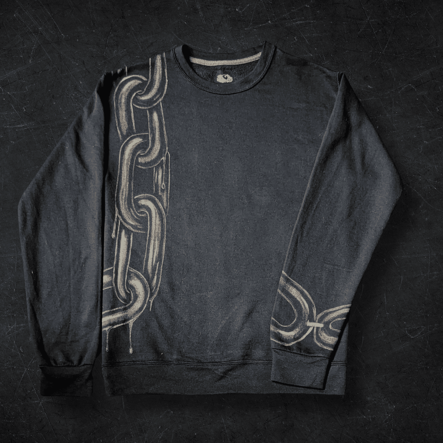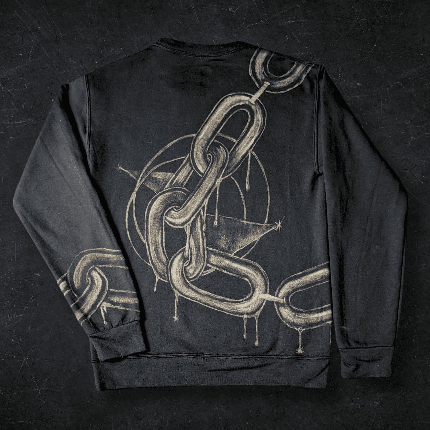 This was the origin point: the first time a design didn’t sit on fabric but moved through it. Not front or back, but both, connecting across seams and sleeves. The chain became the path into immersion, the first step into garments as continuous canvases.