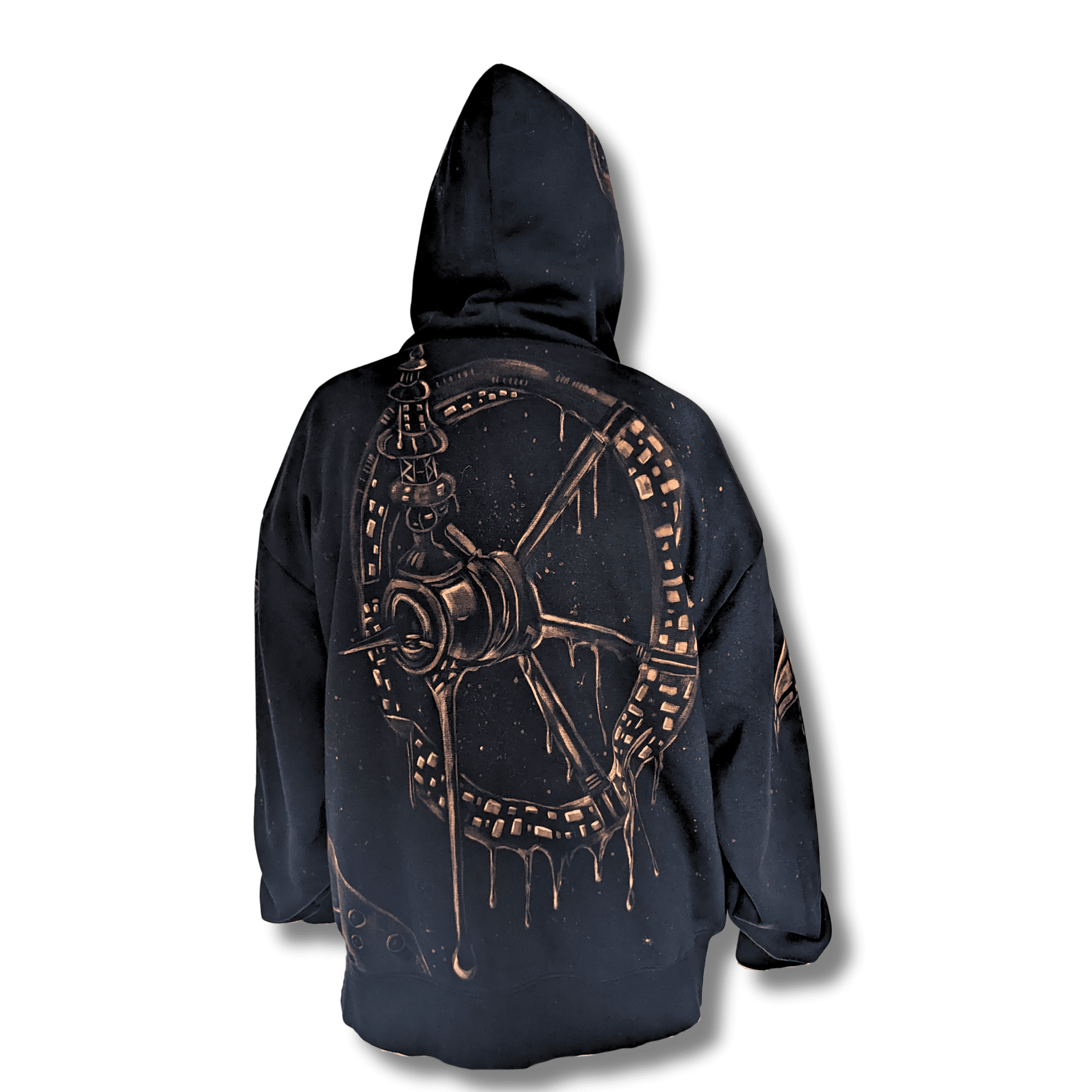 To the left, an astronaut drifts untethered. To the right, a satellite keeps silent watch. A barren planet curves across the hem — not Earth, but somewhere lonelier, more remote. Above, a moon and nebula marks the hood like a moment to reflect.